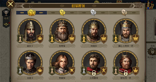 8、点击招募将领,将领属性分为步兵能力、骑兵能力、弓兵能力、内政能力和士气。内政主要影响城市产出加成以及任命为行政官时国家外交、内政加成等。将领通过升级军衔,可以获得能力点数来强化将领的各个属性(可重置),和解锁新的技能槽和士兵槽。传奇将领可通过升级爵位,来提高部队伤害和减伤效果。并且传奇将领都有与其对应的英雄传奇章节和专属装备,专属装备可以加成专属兵种和技能。