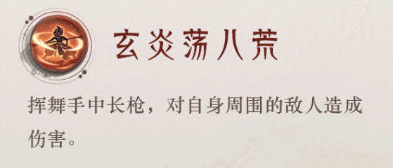 四技能:玄炎荡八荒:挥舞手中长枪,对自身周围的敌人造成伤害。