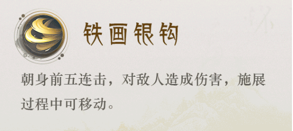 一技能:铁画银钩:朝身前五连击,对敌人造成伤害,施展过程中可移动。