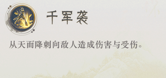 二技能:千军袭:从天而降刺向敌人造成伤害与受伤。