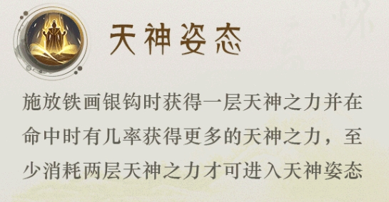 四技能:天神姿态:施放铁画银钩时获得一层天神之力并在命中时有几率获得更多的天神之力,至少消耗两层天神之力才可进入天神姿态。