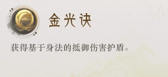 三技能:金光决:获得基于身法的抵御伤害和护盾。