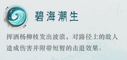 一技能:碧海潮生:挥洒杨柳枝发出波浪,对路径上的敌人造成伤害并附带短暂的击退效果。