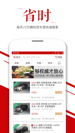 1、自助找车:根据品牌、车型、价格和车龄筛选车辆;支持关键字搜索。